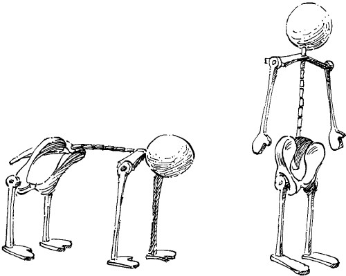 Освобождение передних конечностей привело к тому, что задние конечности приняли на себя весь вес тела. Исходно человеческая спина не была «создана» для поддержания вертикальной позы (что частично объясняет, почему люди так часто жалуются на боли в спине). Чтобы выдерживать этот дополнительный вес, тазовая кость у человека заметно утолщена по сравнению с обезьянами, вследствие чего родовой канал (отверстие, через которое рождается ребенок) существенно сужен. Это сужение повлекло за собой ограничения на размер головы (и мозга) при рождении и, как следствие, удлинение периода младенчества, когда малыш полностью зависим от взрослого. Человеческому младенцу требуются долгие годы такой зависимости, чтобы повзрослеть. Котята, к примеру, становятся самостоятельными уже через несколько недель после рождения. А попробуйте-ка оставить без присмотра и ухода даже двухлетнего малыша!