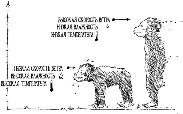 Как на него ни взгляни, этот ничем не прикрытый, горячий и прямолинейный сценарий не тянет на миф о творении. Не слишком-то возвышенное объяснение дает он первоосновам наших достижений. Однако, чтобы обосновать любую из гипотез палеоантропологии, анализа одного только стиля жизни недостаточно (хотя изменения, связанные со способностью делиться пищей и с изготовлением орудий, должны были содействовать приспособлению). Наш интеллект мог оказаться лишь побочным продуктом теплоизоляции.
