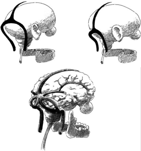 Однако еще не менее миллиона лет после того, как появилось прямохождение, никакого резкого увеличения размеров мозга не происходило. Чего же мозг ждал? Важным физическим пусковым механизмом могли оказаться изменения в кровообращении, вызванные прямохождением. Удаление головы от сердца потребовало усиления кровотока. Сила тяжести, под действием которой менялось расположение сосудов, ведущих к голове, могла модифицировать и кровеносную систему как таковую. Скажем, у жирафа на шее есть некоторое количество дополнительных клапанов, облегчающих кровоток. Однако у предков человека внутричерепной кровоток изменился, устремляясь к шейному сплетению (?vertical plexus = cervical plexus?) вместо яремной вены. Если рассмотреть весь ряд наших предков, то можно заметить кардинальное изменение в распределении крови по мозгу. У наших предков сформировалась широкая сеть эмиссарных вен, ведущих в мозг и из мозга. Размер мозга увеличивался у всех наших предков наряду с расширением этой сети, однако не увеличивался у австралопитеков, у которых столь широкой сети сосудов не было. Усиление кровотока предшествовало и, возможно, обусловило увеличение размеров мозга и изменение распределения в нем нервных клеток.