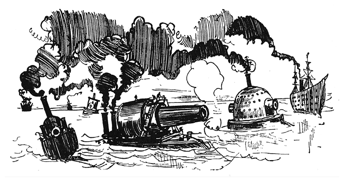 Всеобщий крик, изданный пассажирами лодки, вырвал его из этого созерцания. Шлюпка будто налетела на риф: огромное чудище в железном панцире вынырнуло из пучины прямо под суденышком, которое теперь находилось на его спине, в трех метрах над водой.