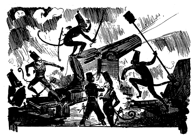 Фарандуль и его люди, ошеломленные, но сердитые, возвращаются к своим орудиям, чтобы в отчаянной борьбе спасти хотя бы честь квадруманов. Ураган огня и железа накрывает форт. Героические обезьяны-артиллеристы едва успевают банить орудия – они горят таким рвением, что и с наступлением ночи отказываются покинуть позиции и продолжают вести огонь по врагу, даже когда английский флот снимается с якоря и выходит в открытое море.