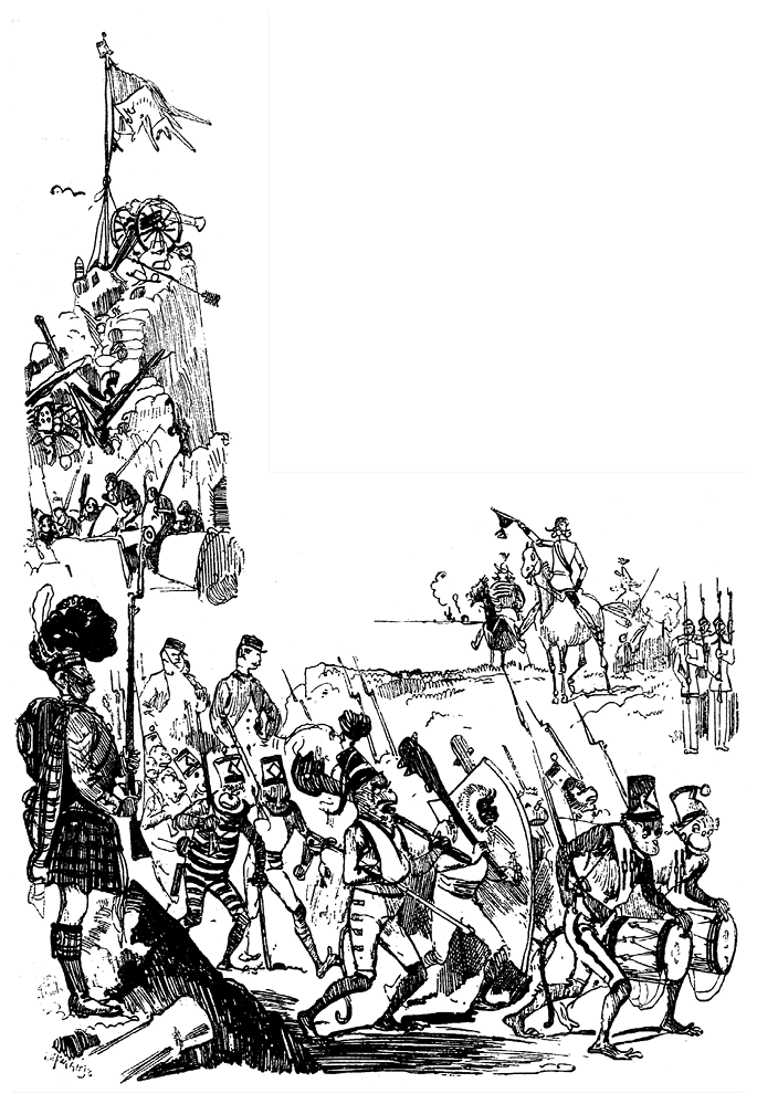 Тем временем лодки пристают к берегу, вражеские армейские подразделения устремляются вперед и теснят пытающихся сопротивляться обезьян. Баркасы снуют туда и обратно между пляжем и кораблями, и вскоре на берегу оказываются уже 8000 англичан, 8000 храбрецов, жаждущих отомстить за неслыханные прошлогодние поражения. Наконец по сигналу флагманского фрегата музыканты заиграли «God save the Queen»[7], и англичане двумя колоннами пошли в атаку на позиции квадруманов.