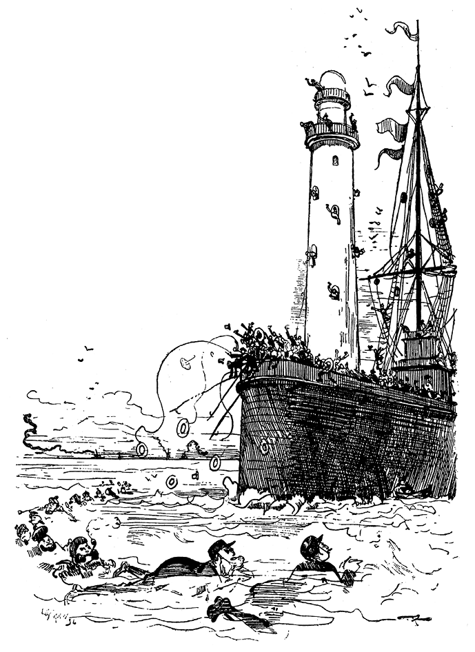 К счастью, все моряки умели плавать. Через минуту после окончательного исчезновения несчастного трехмачтовика семнадцать матросов, с Фарандулем и Мандибюлем во главе, уже плыли по направлению к видневшемуся вдали гаврскому пирсу. Двинувшись в путь в иерархическом порядке, в том же порядке они и приблизились к береговому трапу. Проигнорировав протянутые руки, они проворно выбрались на берег, но едва поднялись на набережную, как единый порыв заставил их всех воздеть длани, и одно и то же слово вырвалось из их ртов: