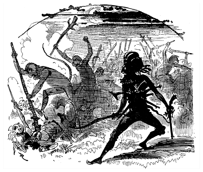 – Вперед, «Прекрасная Леокадия»! Вперед, обезьяны! – кричит Фарандуль и ударом дубинки, с которой он обращается не менее ловко, чем его четверорукие союзники, разбивает череп уже ухватившемуся за борт своей пироги Бора-Боре.