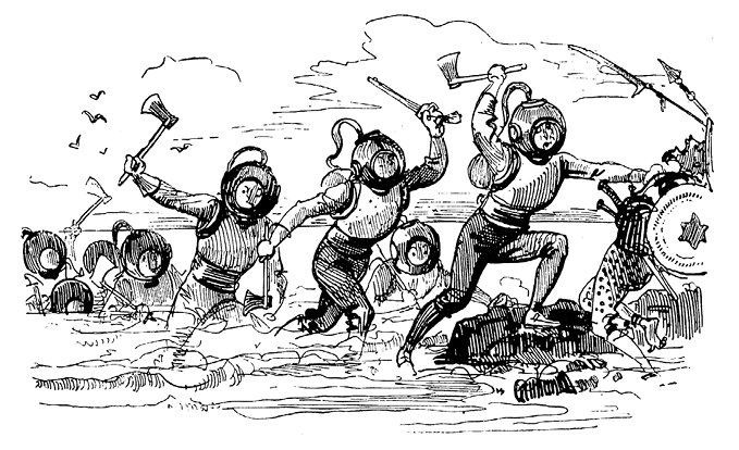 Что до фантастических существ с железными головами, то это была рота водолазов, любезно предоставленная капитаном «Наутилуса».