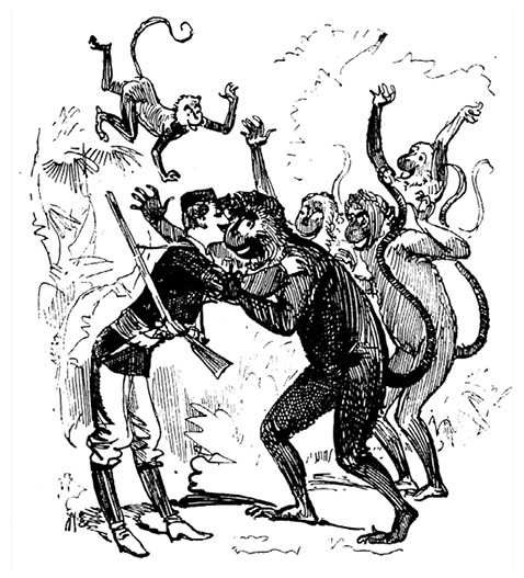Странная штука! Возглавляет этот обезьяний отряд какой-то человек – человек ли? – чередующий слова приказов с гортанными криками, от которых обезьяны подпрыгивают и бросаются в атаку.