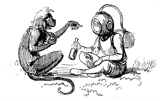Матросы и обезьяны разглядывали друг друга со взаимным удивлением; но больше всего бравых орангутанов, похоже, заинтриговали люди с железными головами, водолазы с «Наутилуса». Как же! Еще одна новая человеческая раса! Это разрушало все их представления об устройстве материального мира, и так уже расстроенные появлением на их острове в компании подобных ему существ Фарандуля… Но эти странные особи с большими круглыми кумполами и хвостом на голове – откуда взялись они?