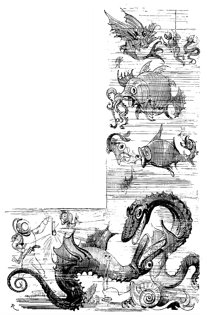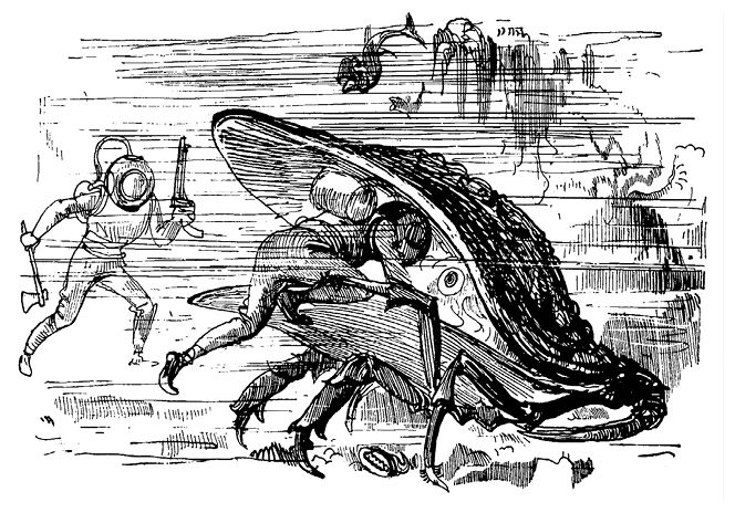 Вооруженные до зубов – топорик в руке, два пневматических револьвера и острый кинжал за поясом – матросы устремлялись к липким скалам, в пещеры, где водились неизвестные человеку чудовища, каких может нарисовать лишь самое воспаленное воображение: шестиметровые омары, морские крокодилы, осьминоги-торпеды, крабы с тысячью клешней, морские змеи, рыбы-слоны, гигантские устрицы и т. д.