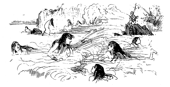 Бесполезно! Визжа от страха, все поспешно выскочили из воды и, даже не подобрав своих одежд, унеслись в направлении скал; одна лишь Мизора, забравшаяся на вершину одинокого утеса – своеобразного островка, – не смогла убежать.