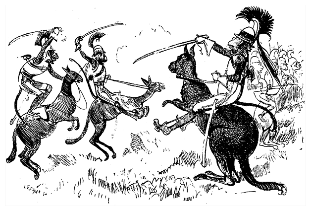 Впрочем, Фарандуля беспокоило другое. Из всех регулярных армий мира лишь у одной только квадруманской армии не было кавалерии! То было серьезное упущение, которое в определенных случаях могло иметь катастрофические последствия; по зрелом размышлении Совет решил, что для этой службы можно было бы попробовать использовать кенгуру, отдав им предпочтение перед лошадьми, к которым обезьяны испытывали безотчетную антипатию.