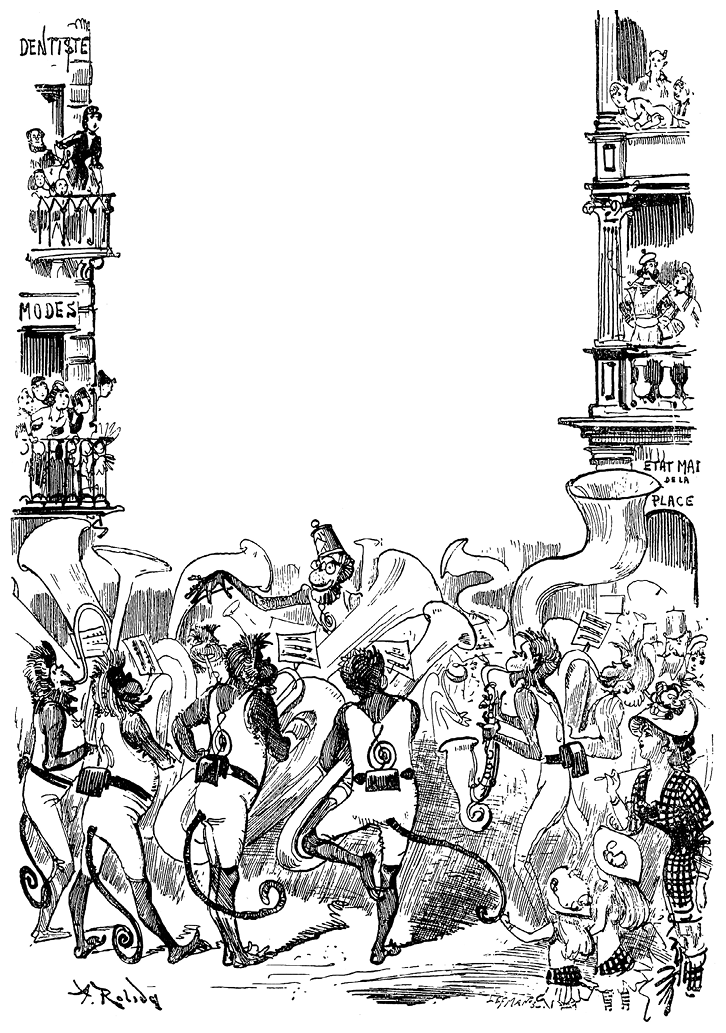 Примеру полковника Эскубико, коменданта города Альбертон, последовали и другие командиры. Прекрасные военные оркестры были сформированы в каждой бригаде, под руководством капельмейстеров-биманов, привлеченных на службу за высокое жалованье. Оркестр Эскубико, организованный на испанский манер, насчитывал сорок обезьян в украшенных эмблемами из слоновой кости вместо кокард небольших шапочках, какие носят испанские студенты, притом что играли эти обезьяны в основном на гитарах, бубнах и кастаньетах; прочие оркестры были вооружены большими медными инструментами, звучавшими просто ужасно во время военных променадов. В послеобеденные часы эти оркестры постоянно играли под окнами начальника гарнизона; там можно было услышать – причем в блестящем исполнении – все европейские новинки и даже пьесы, явившиеся плодом музыкального вдохновения квадруманов и исполняемые не менее блестяще!