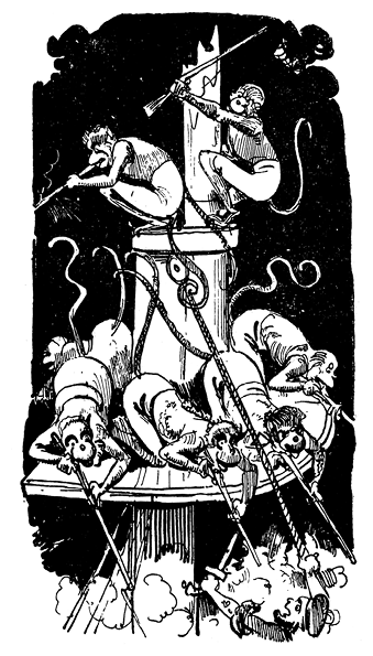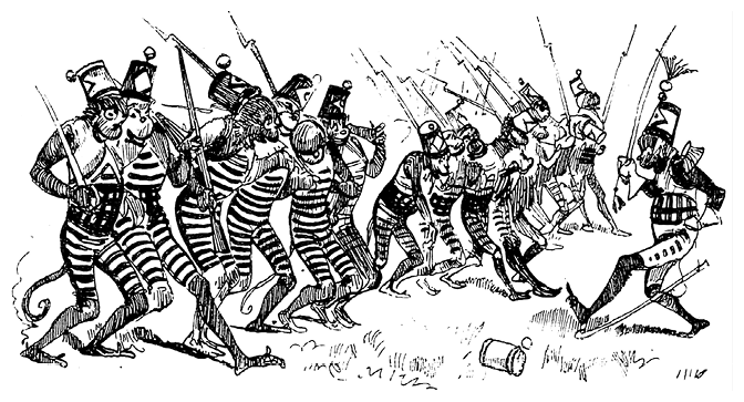 Несколько обезьян, устыдившихся своей провинности, уже вернулись под знамена Фарандуля, остальные продолжали с утра до вечера упиваться английским спиртным; служба доставки продовольствия превратилась в службу доставки алкоголя, интендантские обозы подвозили уже одни лишь горячительные напитки.