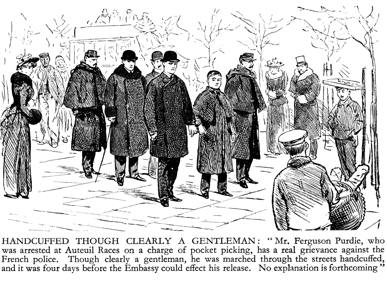 In other words, you only had to flash the Victorian equivalent of a Platinum Amex to get an apology and be on your way. The French Sûreté, infinitely superior to its British equivalent at Scotland Yard, suffered no such upper-crust delusions. ‘Handcuffed Though Clearly a Gentleman’ is the title of this cartoon from 1892. Some English con artist called Ferguson Purdie had been arrested on a charge of pickpocketing at the Auteuil races. The French police had him in ‘cuffs’, and the Illustrated London News went into shock. He was Clearly a Gentleman! All the elements of British class absurdity and wooden-headed xenophobia are encapsulated in this little sketch.