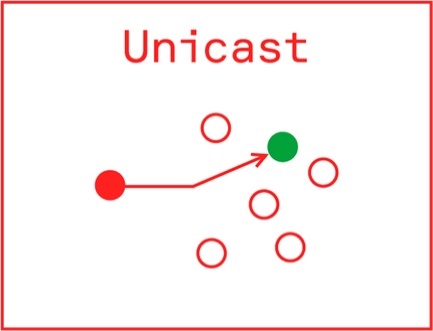 Самый простой метод передачи. В этом методе пакеты данных передаются уникально, т.е. от клиента сети к клиенту. Такой пакет данных может быть передан только одному устройству. Сетевые свитчи (принцип, который мы разберем чуть позже), получая такой пакет данных, переправят его на физический порт конкретного устройства, которое должно получить эти данные.