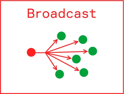 Широковещательный метод передачи данных, где один пакет данных передается всем участникам сети (или подсети), в независимости от их адреса. По этому принципу очень часто работает протокол ArtNet. Для этого метода в каждом уровне диапазона сетей зарезервирован адрес 255.