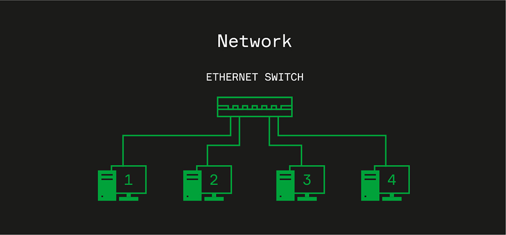 Чтобы построить сеть, нам необходимо иметь то, что должно участвовать в сети. Это могут быть контроллеры, компьютеры, смартфоны, планшеты, консоли управления и многое, многое другое. Давайте разберем простейший пример, в котором у нас есть четыре компьютера.