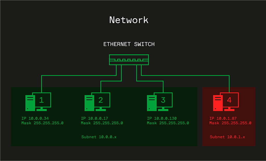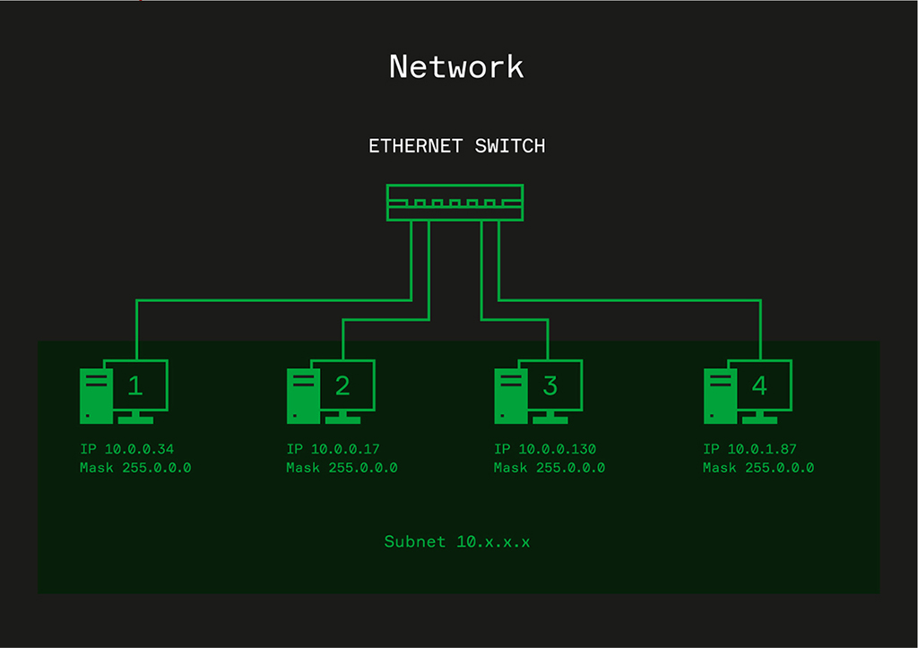 Возьмем адресное пространство 10.x.x.x. Если мы хотим максимально закрыть нашу сеть, мы устанавливаем маску подсети 255.255.255.0. В этом случае, если мы хотим, чтобы наши компьютеры были в одной подсети и могли друг друга видеть, то их IP адреса должны иметь одинаковые первые три цифры адреса. К примеру, 10.0.0.x. Диапазон адресов нашей подсети будет составлять от 10.0.0.1 до 10.0.0.255. Но если в этом случае один из компьютеров будет иметь IP адрес 10.0.1.87, то он будет находиться в другой подсети (10.0.1.1—10.0.1.255), и для первой подсети он будет не виден.