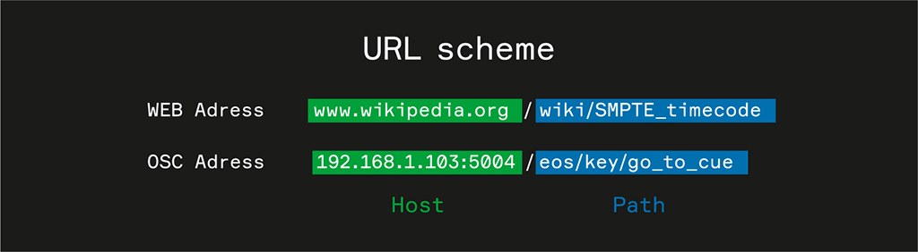 Хорошо, OSC сообщение мы доставили в нужный порт, и программа клиента прочитала это сообщение. Но как же программе понять, к чему применить это сообщение? Для этого OSC сообщение содержит адрес назначения внутри программы клиента. Это очень похоже на параметр назначения MSC сообщения, к примеру, как Cuelist или Cue. Только, как я уже сказал выше, OSC не имеет жесткой привязки к синтаксису адреса как в MSC, но тем не менее мы должны соблюдать правила описания адреса, которое использует OSC, а именно URL (Uniform Resource Locator). Эту схему описания адреса пути вы используете каждый раз, когда пользуетесь интернет браузером, чтобы попасть на конкретное место в интернет сайте.