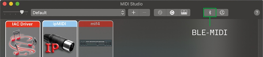 Чтобы попасть в настройки BLE-MIDI в MAC OS, так же, как и в случае с RTP-MIDI, нам нужно открыть окно MIDI Studio. Напомню, для этого нужно зайти в папку Applications и открыть приложение Audio MIDI Setup. Если перед вами откроется окно настроек аудио, без окна MIDI, в панели меню откройте Window и в выпадающем меню нажмите на опцию Show MIDI Studio. Перед вами откроется окно со всеми MIDI картами, которые подключены к системе, и также вы увидите иконки для доступа к дополнительным меню для работы с технологиями передачи MIDI.
