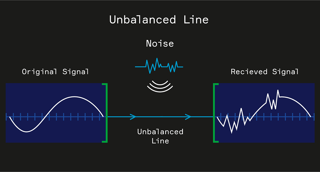 Небалансный (также его называют несимметричный, линейный) сигнал передается по двум проводам: один провод сигнал, другой – земля. Данный способ передачи сигналов отличается исключительной простотой реализации, однако он не способен противостоять помехам на физическом уровне.