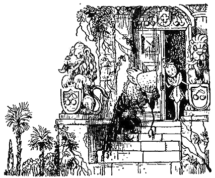 Принц отряхнулся и направился к воротам, но вдруг услышал громкие голоса. Он спрятался за стог сена и пропустил мимо себя какую-то шумную компанию. (Вы знаете, из кого она состояла.) Затем принц поднялся по ступенькам замка и позвонил. Отперла ему дверь Земляничка.
