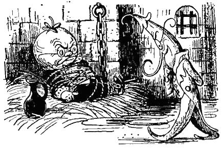 Все трое с важным видом, какой подобает представителям закона, гуськом спустились в подземелье. Помидор вытащил из правого чулка ключи, открыл тяжёлую дверь, но с такой поспешностью отскочил назад, что сшиб с ног синьора Петрушку, который стоял у него за спиной. Из камеры неслись жалобные стоны. «Мяу! Мяу!» – пронзительно мяукал деревенский Кот, корчась от невыносимых страданий.