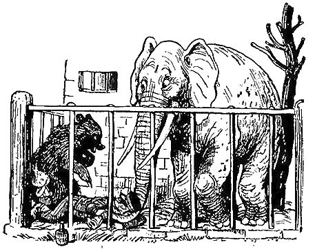 – Что ж, – задумчиво пробормотал старый Слон, – пожалуй, я и мог бы дать вам совет, но только к чему это? В лесу не лучше, чем в клетке, а в клетке не хуже, чем в лесу… Не знаю, прав я или нет, но мне кажется, что каждый должен оставаться на своём месте… Впрочем, если вы уж очень этого хотите, – добавил он неожиданно, – я могу вам сказать, что ключ от клетки с медведями находится в кармане у этого спящего человека, моего сторожа. Я попытаюсь вытащить ключ, не разбудив его. Сон у него крепкий. Надеюсь, он ничего не почувствует.