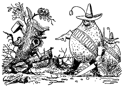 Сыщик и его собака размяли ноги и помчались продолжать свои поиски. Проводив их удивлённым взглядом, дровосек принялся было рубить дуб, как вдруг перед ним появился целый взвод Лимончиков с офицером Лимоном во главе.
