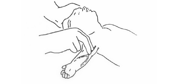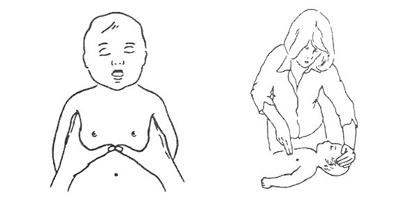 При условии, что реаниматор один, циркулярный обхват заменить на нажатие двумя пальцами одной руки (указательный и средний), одновременно поддерживая проходимость дыхательных путей второй рукой.