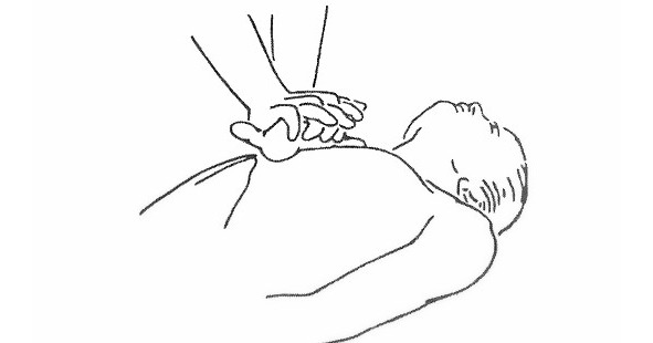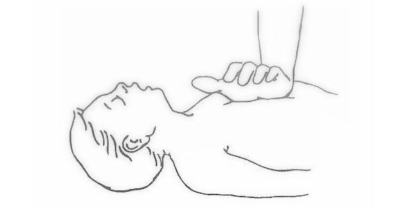 – Искусственный массаж сердца основанием ладони с приподнятыми пальцами, ниже сосковой линии, середина грудной клетки, на глубину 3—4 см, 80—120 компрессий в минуту.