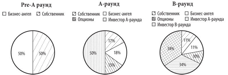 Рис. 1. Пример размытия доли собственника при нескольких раундах финансирования