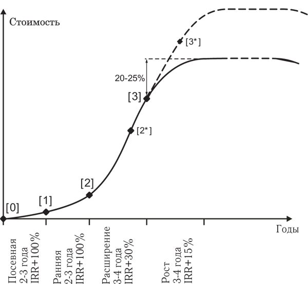 Точка [3] – это точка, когда созданная стоимость превращается в деньги. По большому счёту, существует всего два способа капитализации созданной стоимости. Это выход на публичный рынок, или продажа бизнеса стратегическому инвестору.