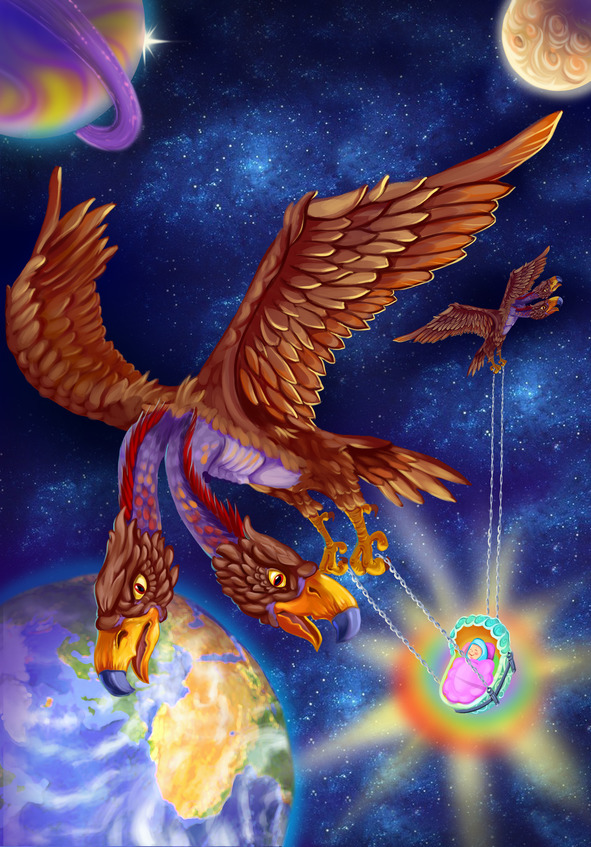 …На следующий день отец Дионы решил отправиться за щенком в город, но как только он покинул хижину, увидел, что погода резко ухудшилась. Небо стало свинцово-серым, завывал ветер, а низкие тучи быстро меняли свою форму. Вдали что-то приближалось… Какие-то темные пятна на горизонте, которые при ближайшем рассмотрении оказались огромными двухголовыми птицами. Они были столь велики, что ветер от их крыльев ломал на земле деревья и вызывал в горах камнепады.
