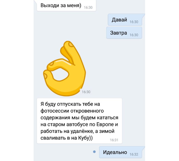 Он: Вотсапа нет. Ты можешь мне в социальной сети при желании писать.