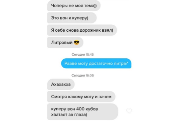 Начинаю смеяться. Какой весёлый! Я отправляю ему свое фото с мотоциклом – простава.