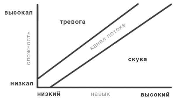 Поток измеряется двумя векторами: навыком и сложностью. Если игроку удается держаться между этими векторами, то он будет в состоянии потока. Но если игра слишком тяжелая или скучная, то он выпадет из потока, испытает разочарование или даже прервет партию.