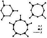 Рис. 19б. Схема строения простейших водных ассоциативов (кластеров): тример, тетрамер и пентамер: 1 – атом водорода; 2 – атом кислорода; 3 – водородная связь