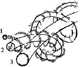Рис. 25. Солнечная система в четырехмерности: 1 – Луна; 2 – Земля; 3 – Солнце