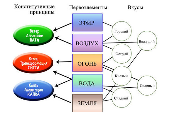 В аюрведе есть теория о вкусах. Их всего 6: сладкий, кислый, соленый, горький, острый и вяжущий. Каждый продукт обладает вкусом, и послевкусием. Считается, что каждый вкус влияет на дошу либо в сторону ее увеличения, либо в сторону уменьшения.