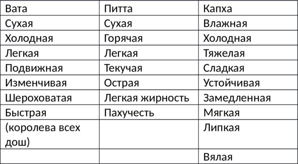 – Мягкость. Тело у капхи рыхлое, мягкое. Речь и характер тоже мягкий.