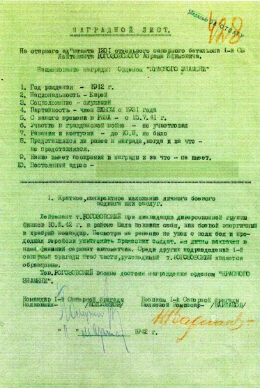 Наградной лист на лейтенанта Рогозовского орденом «Красного знамени». Вверху надпечатка: медаль за «Отвагу