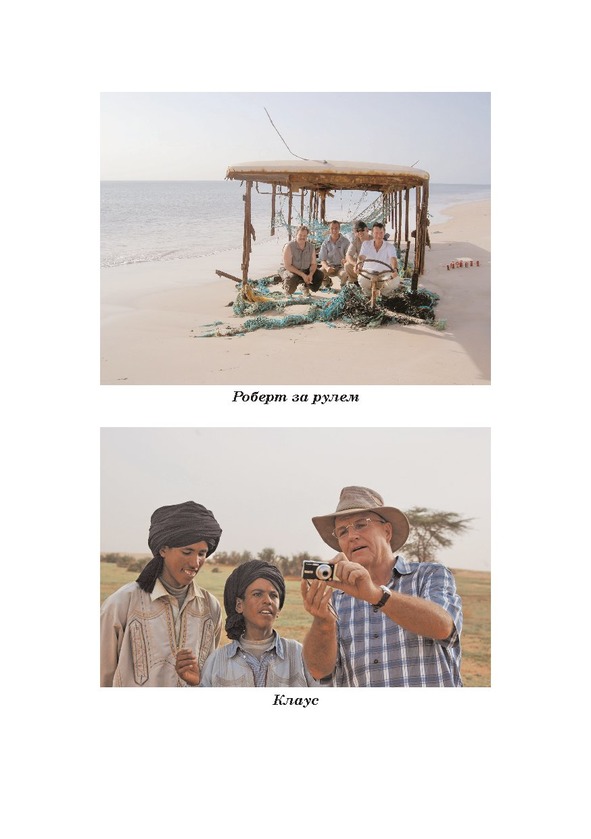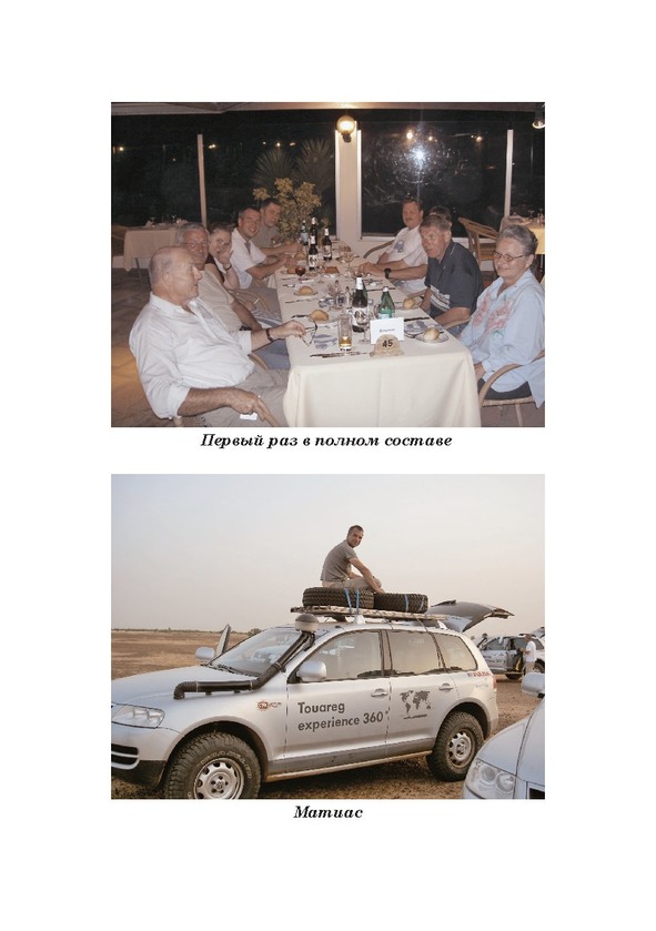 Пожалуй, можно было бы закончить повествование о подготовке к началу экспедиции, о распределении машин и мест в колонне, но оставалась еще групповая фотография и к ней, как оказалось, отдельные персонажи подошли с романтичной ноткой. Все, в общем-то, были одеты обычно, кроме троих. Мое появление в костюме «от Рембо», с пристегнутым к жилету ножом, вызвало интерес и насмешки на тот предмет, что со времен борьбы с апартеидом белым нежелательно появляться в Африке в таком виде. Но все померкло на фоне Гюнтера и Экки. Вот уж кто в душе романтик, так это они. Они предстали перед нами в специально подготовленных белоснежных комбинезонах, расписанных по всем правилам. На рукавах красовались вышивки Дакар – Вольфсбург, на груди немецкий флаг рядом с фамилией, и в таком духе был расписан весь комбинезон. Дополняла наряд зеленая кепка, цвет ее наверняка был подобран для демонстрации уважения к мусульманским странам, по которым предстояло двигаться. Общая фотография была сделана. И наша колонна начала вытягиваться в линию, выезжая с территории отеля. Провожающих не было, но вся торжественность пошла в наших душах после волнения, пережитого в перипетиях попыток попасть в Дакар и пришедшего на смену чувства, что мы смогли все преодолеть.