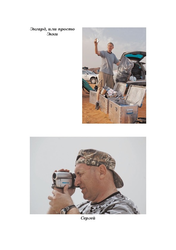 Гюнтер и Экки – о таких у нас говорят: «старики-разбойники». Хотя про стариков явно зря. Их энергии, жизнелюбию, желанию познать новое могут позавидовать многие молодые, а ведь обоим за 60. Столько энергии, интересных предложений и разных шуток, сколько привнесли оба в нашу команду, не сделал никто. А когда они в день старта появились в специально подготовленных и расписанных соответствующим образом комбинезонах, это произвело неизгладимое впечатление. Оба шутники и балагуры, не унывающие никогда. Единственное, что их отличало, Экки был более серьезен, а на губах Гюнтера постоянно блуждала хитрая улыбка. Это они придумали для себя игру в «водителя и шефа», что означало, кто из двоих должен укладывать чемоданы в машину.