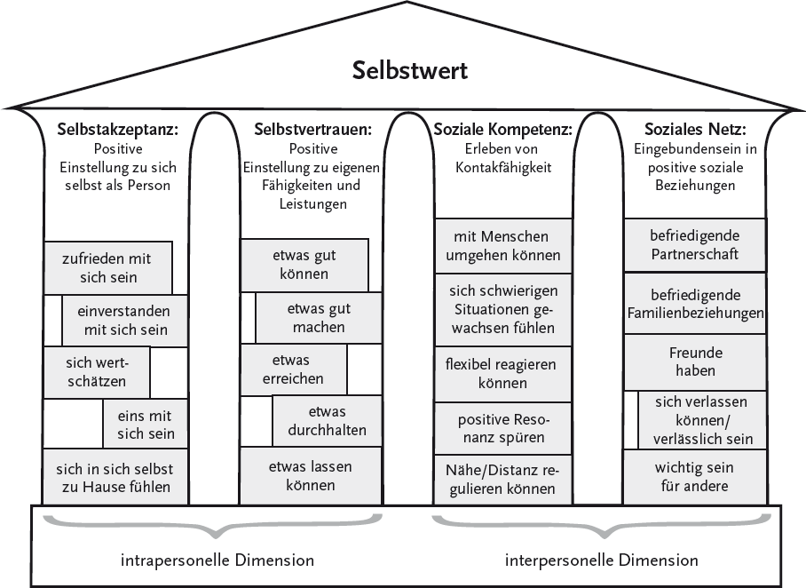 Nach den Psychologinnen und Psychotherapeutinnen Friederike Potreck-Rose und Gitta Jacob (2003, S. 70 ff.) ruht der Selbstwert auf den vier Säulen Selbstakzeptanz, Selbstvertrauen, soziale Kompetenz und soziales Netz (Abb. 2). Den Autorinnen zufolge beschreibt Selbstakzeptanz die positive Einstellung zu sich selbst: sich selbst anzunehmen, wie man ist, mit allen Stärken und Schwächen, mit seinem Aussehen, seinen Bedürfnissen und Grenzen. Das Selbstvertrauen gründet sich in einer positiven Einstellung gegenüber den eigenen Fähigkeiten und Leistungen sowie dem eigenen Können und den damit erzielten Ergebnissen. Soziale Kompetenz beschreiben die Autorinnen als »das Erleben von Kontaktfähigkeit« (ebd., S. 77 f.). Sozial kompetent ist jemand, der flexibel reagieren und sich an Menschen und Situationen in angemessener Form anpassen kann. Das soziale Netz steht schließlich für die Eingebundenheit in unterschiedliche soziale Systeme und eine stabile wechselseitige Qualität der Beziehungen im Hinblick auf Verlässlichkeit und Wichtigkeit (ebd., S. 78 f.).