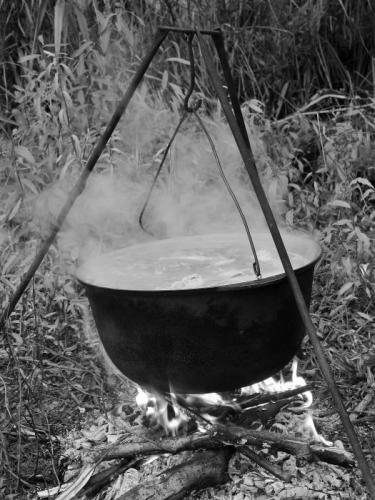 Когда мужики сообщили о готовности, я спросила про пресловутую рюмку водки, которую надо добавлять в готовую уху – для прозрачности. Не, сказали, водку – это мы внутрь, чего продукт изводить, глупости все это. Зато взяли головешку из костра и сунули в котелок с ухой, аж зашипело и вскипело. «А это зачем?» – спрашиваю. «Всегда так делаем, ритуал такой, да и если привкус тины или желчи рыбьей, то на себя уголь возьмет, меня еще так дед учил», – сказал егерь.