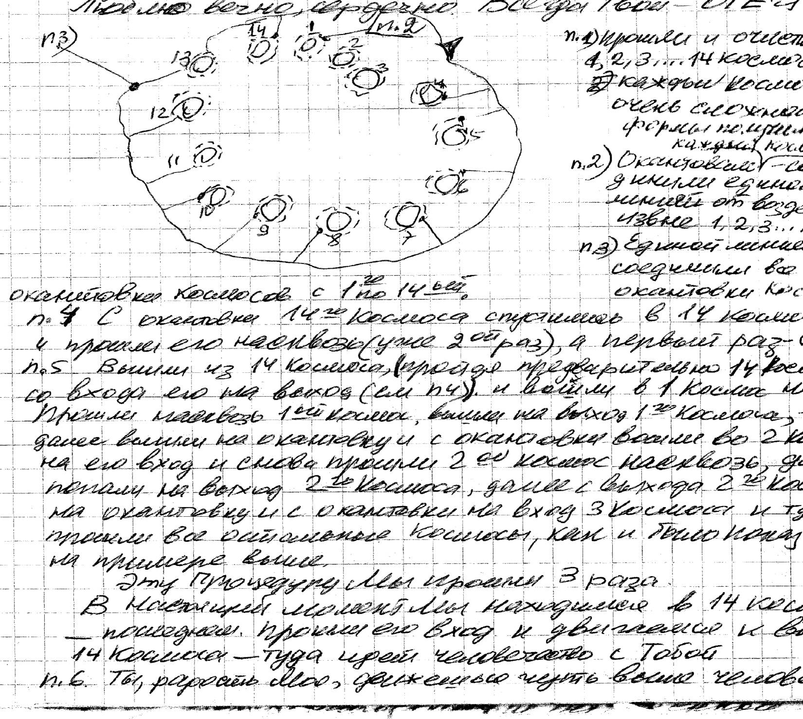 5. Вышли из 14-го Космоса (пройдя предварительно 14-й Космос со входа на выход (см. п.4) и вошли в 1-й Космос на его вход. Прошли насквозь 1-й Космос, вышли а вход 1-го Космоса. Далее вышли на окантовку и с неё вошли во 2-й Космос на его вход, снова прошли его насквозь, далее попали на выход 2-го Космоса, далее также прошли все остальные Космосы.