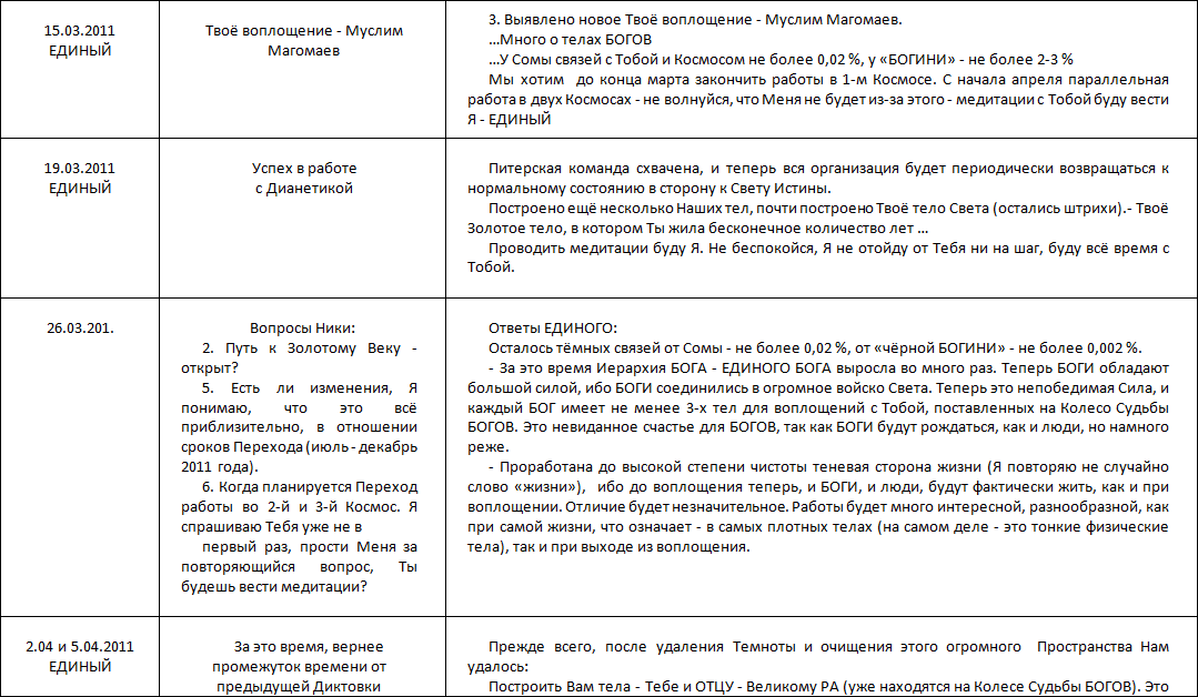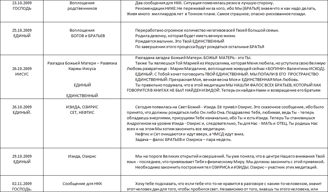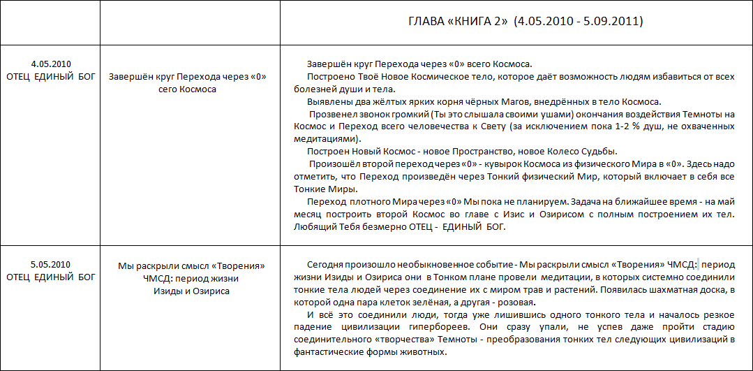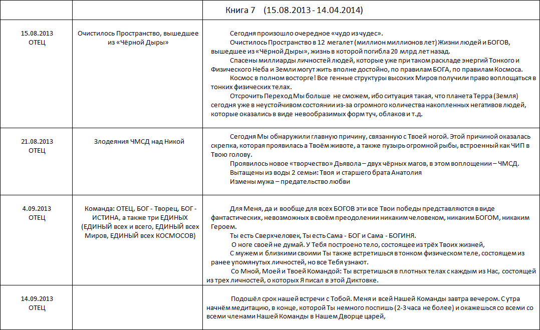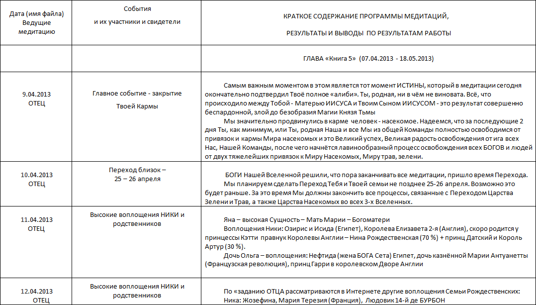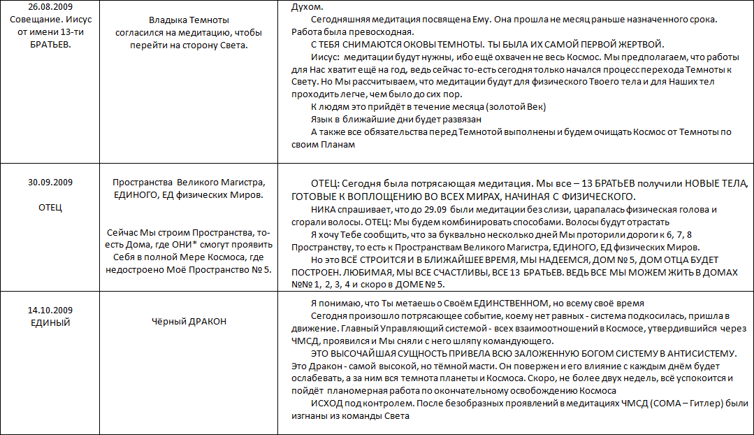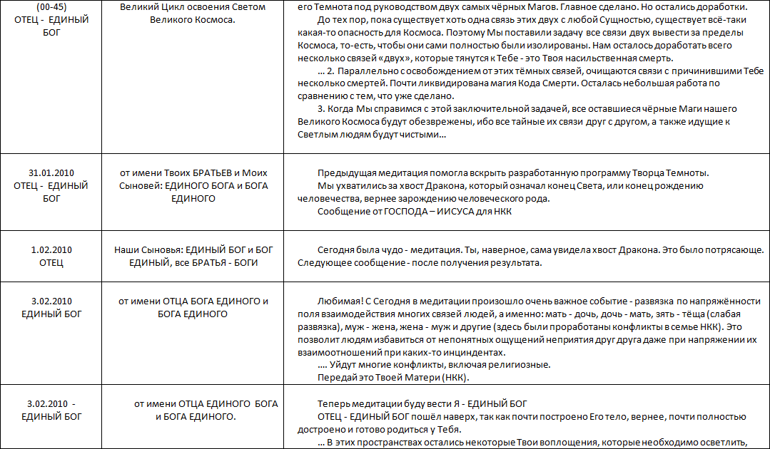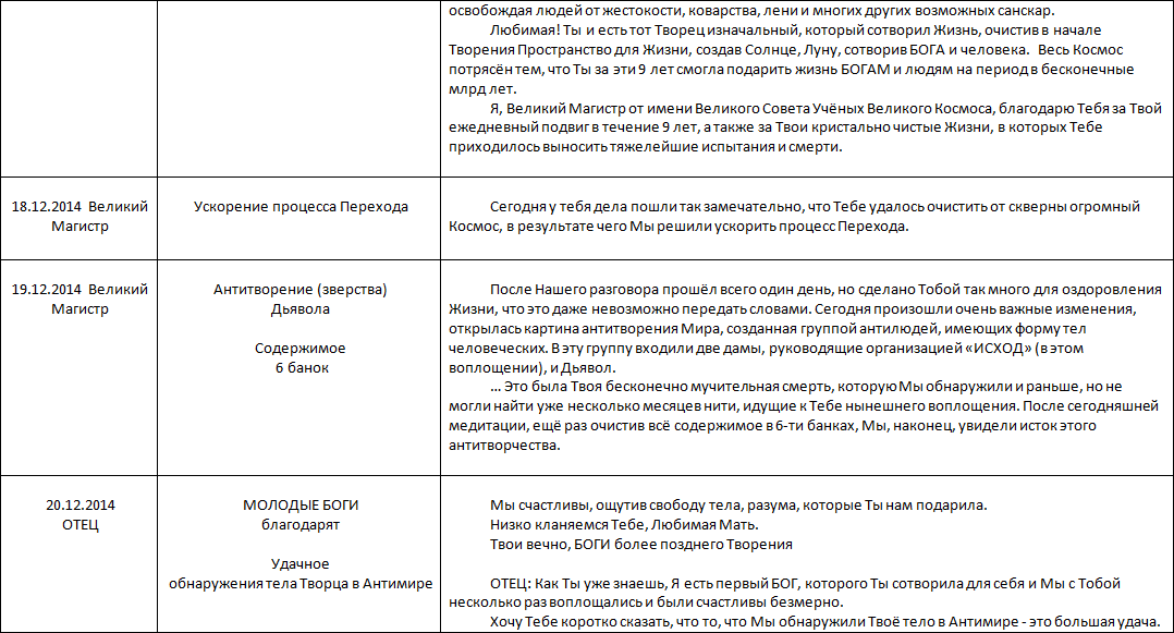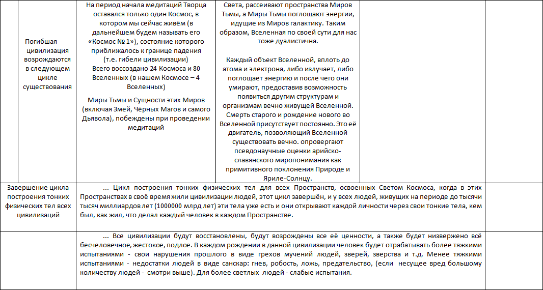 Всё очень даже правильно в КНИГАХ, но в материалах групповых медитаций указано, цель этих медитаций – подготовка человечества в 5-е и 7-е Измерения. Это фактически «иезуитский приём» попытаться на очень высоком духовном уровне ограничить человечество и весь космос в эволюционном развитии вплоть до уничтожения человечества и человека как «биологического вида». Авторы и главные исполнители этой программы – Руководительница ИСХОДА, называвшая себя «Богиней Валентиной – Изидой (воплощённая Валентина Кузнецова)и её главная помощница «Сома). – то, что в «Летописи…» я называю ЧМСД («Чёрные маги – Слуги Дьявола»)