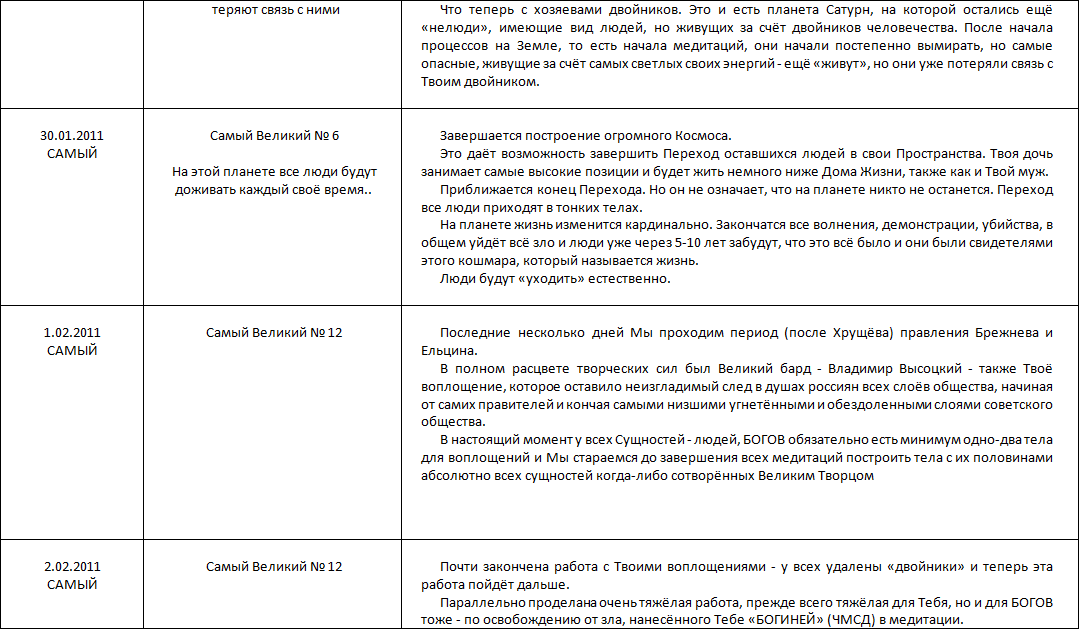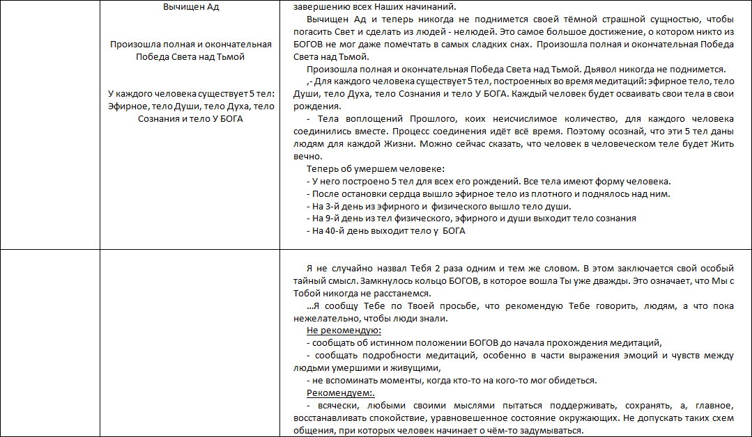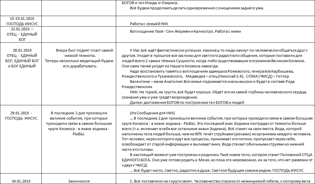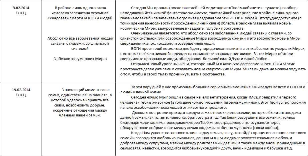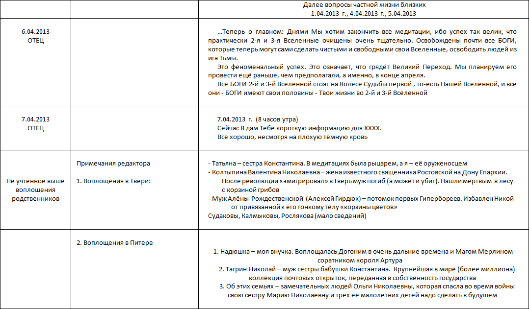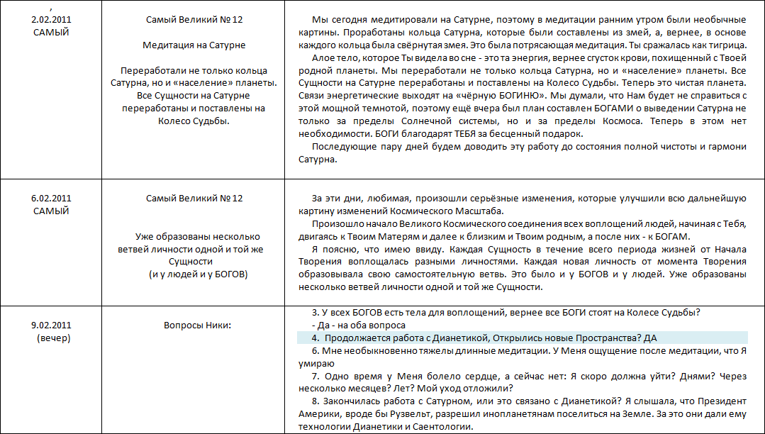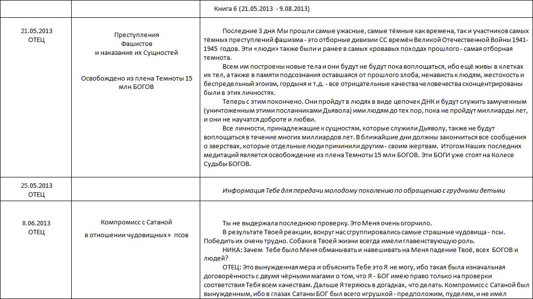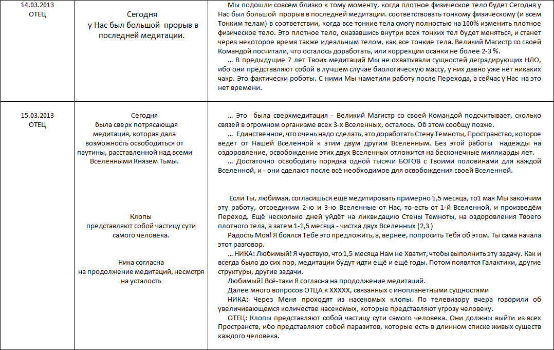 Всё очень даже правильно в КНИГАХ, но в материалах групповых медитаций указано, цель этих медитаций – подготовка человечества в 5-е и 7-е Измерения. Это фактически «иезуитский приём» попытаться на очень высоком духовном уровне ограничить человечество и весь космос в эволюционном развитии вплоть до уничтожения человечества и человека как «биологического вида». Авторы и главные исполнители этой программы – Руководительница ИСХОДА, называвшая себя «Богиней Валентиной – Изидой (воплощённая Валентина Кузнецова)и её главная помощница «Сома). – то, что в «Летописи…» я называю ЧМСД («Чёрные маги – Слуги Дьявола»)