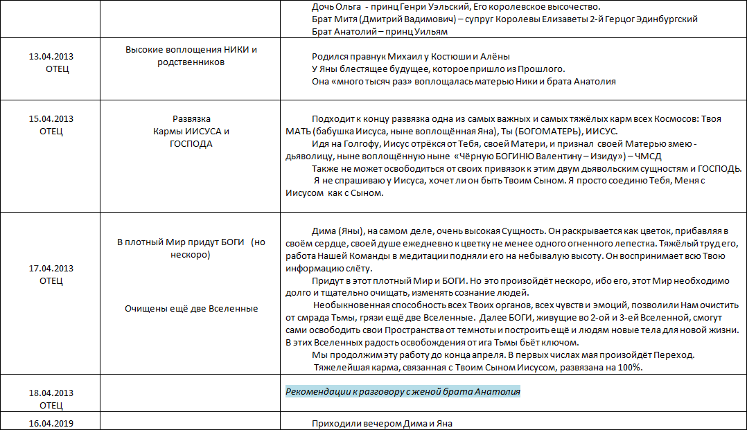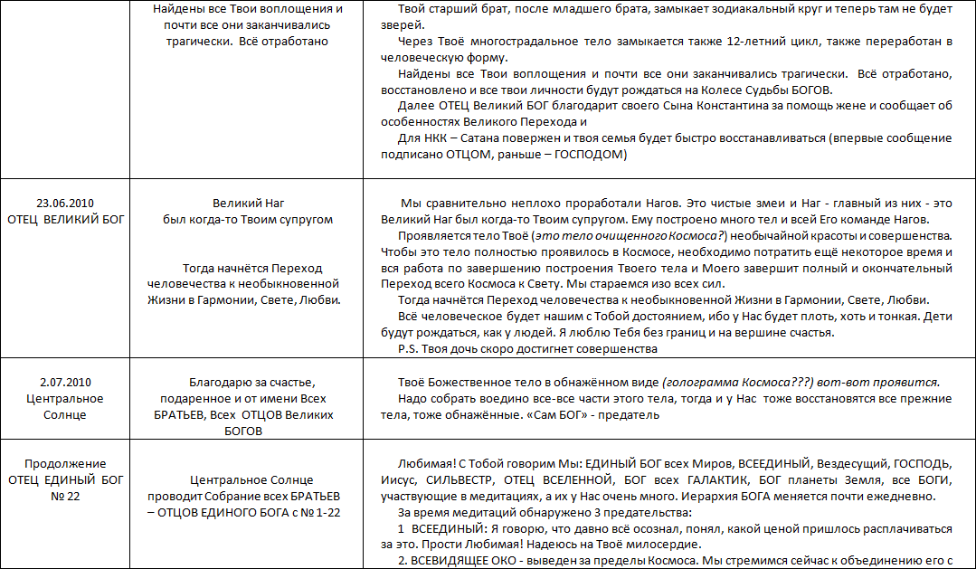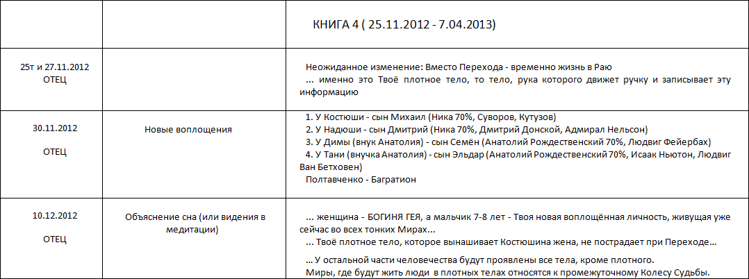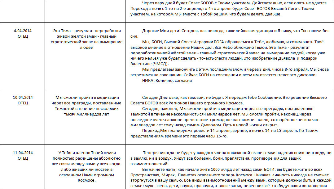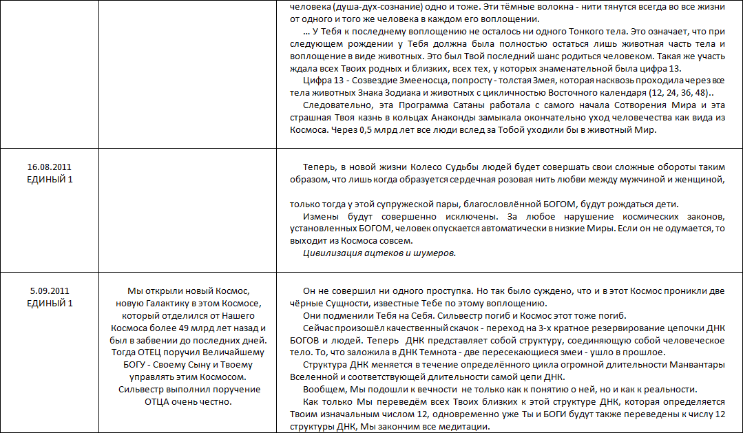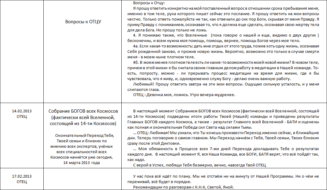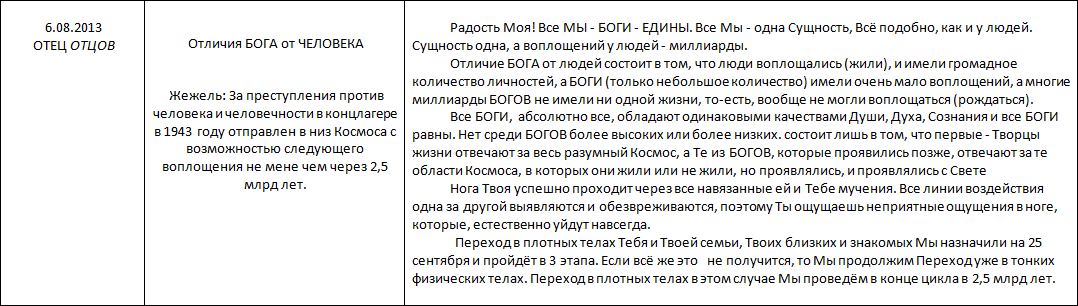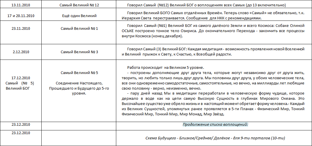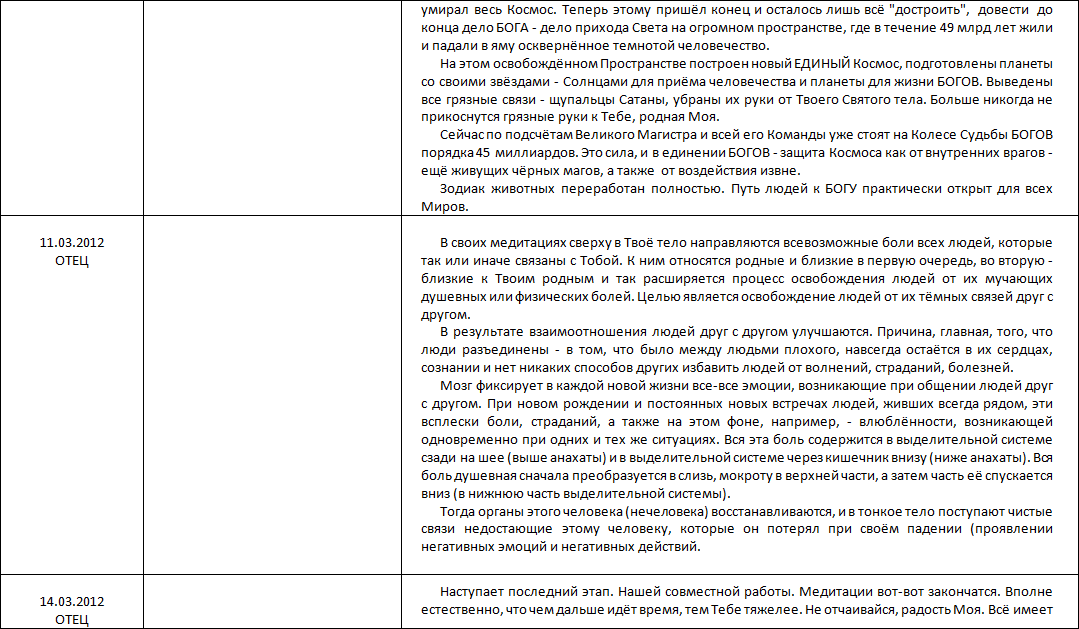 Всё очень даже правильно в КНИГАХ, но в материалах групповых медитаций указано, цель этих медитаций – подготовка человечества в 5-е и 7-е Измерения. Это фактически «иезуитский приём» попытаться на очень высоком духовном уровне ограничить человечество и весь космос в эволюционном развитии вплоть до уничтожения человечества и человека как «биологического вида». Авторы и главные исполнители этой программы – Руководительница ИСХОДА, называвшая себя «Богиней Валентиной – Изидой (воплощённая Валентина Кузнецова)и её главная помощница «Сома). – то, что в «Летописи…» я называю ЧМСД («Чёрные маги – Слуги Дьявола»)