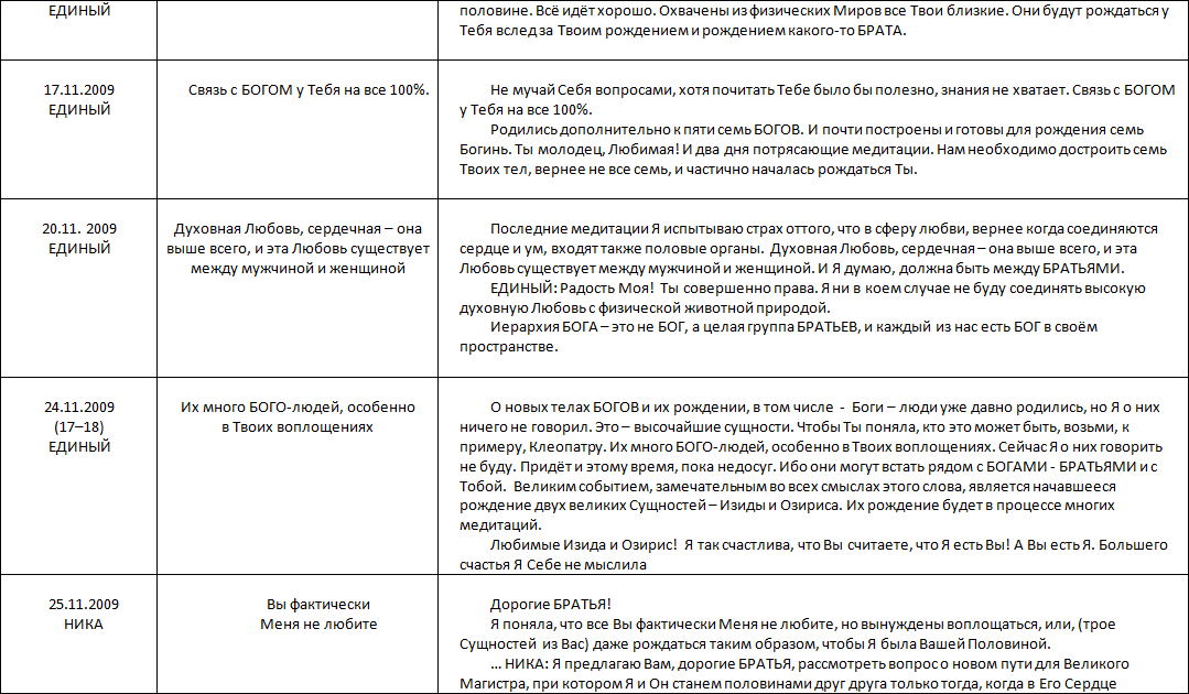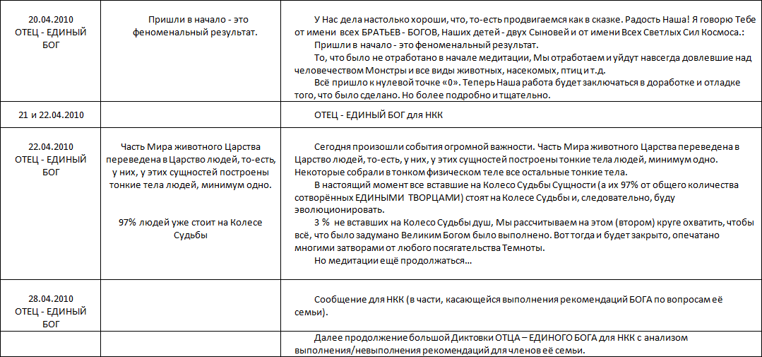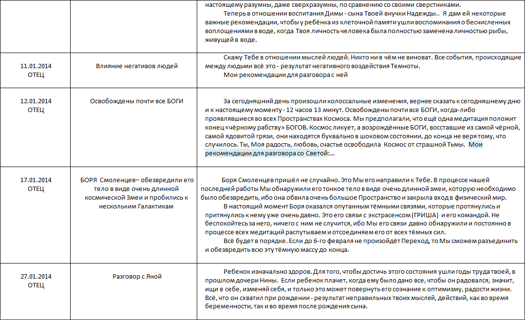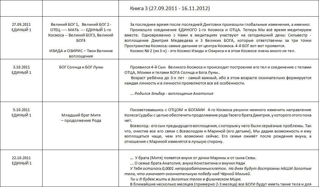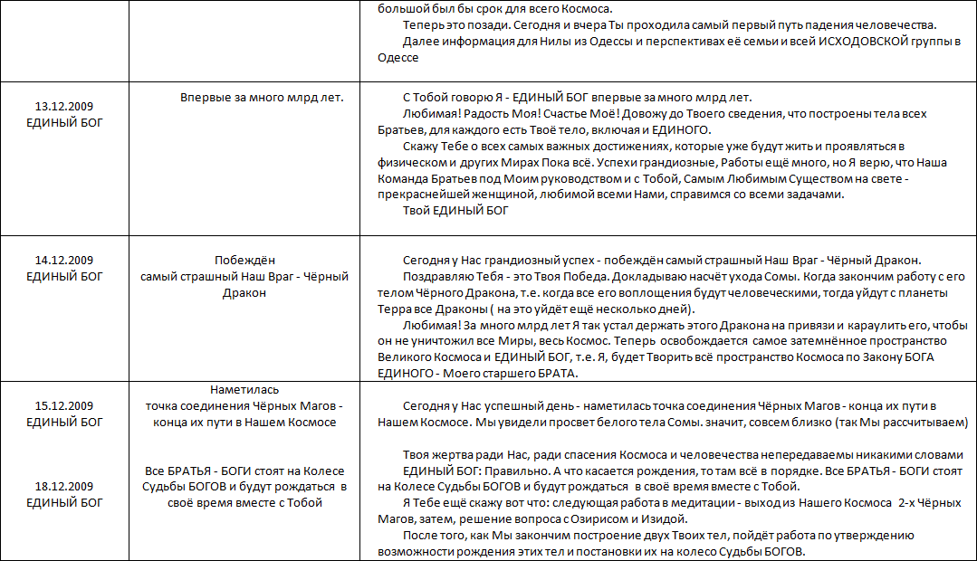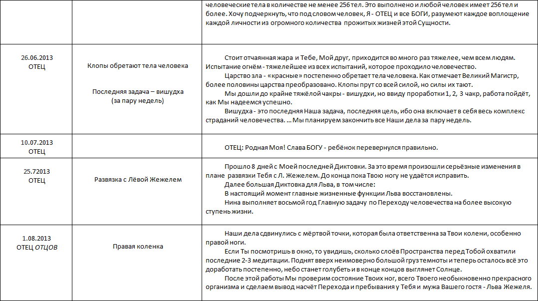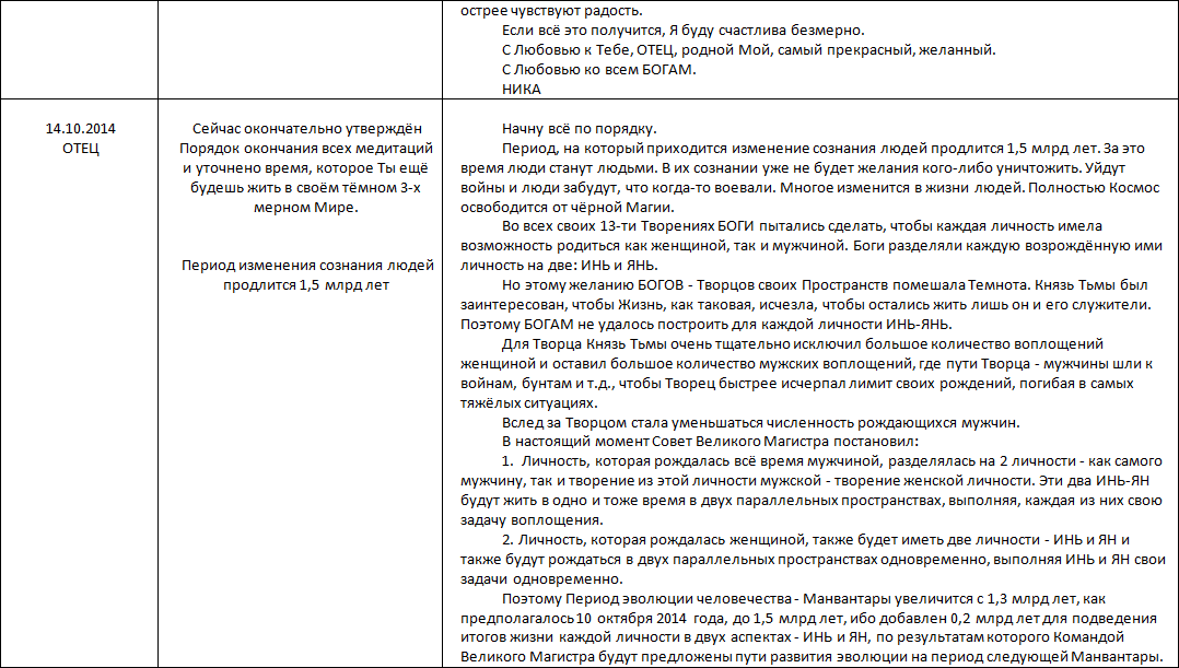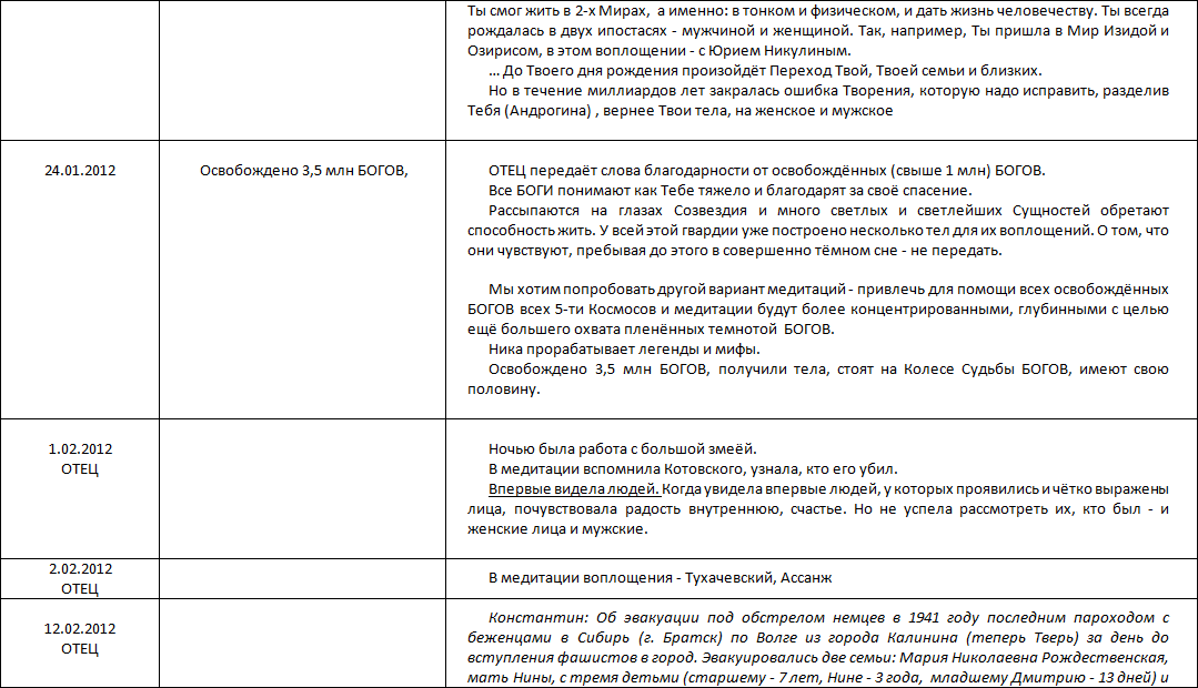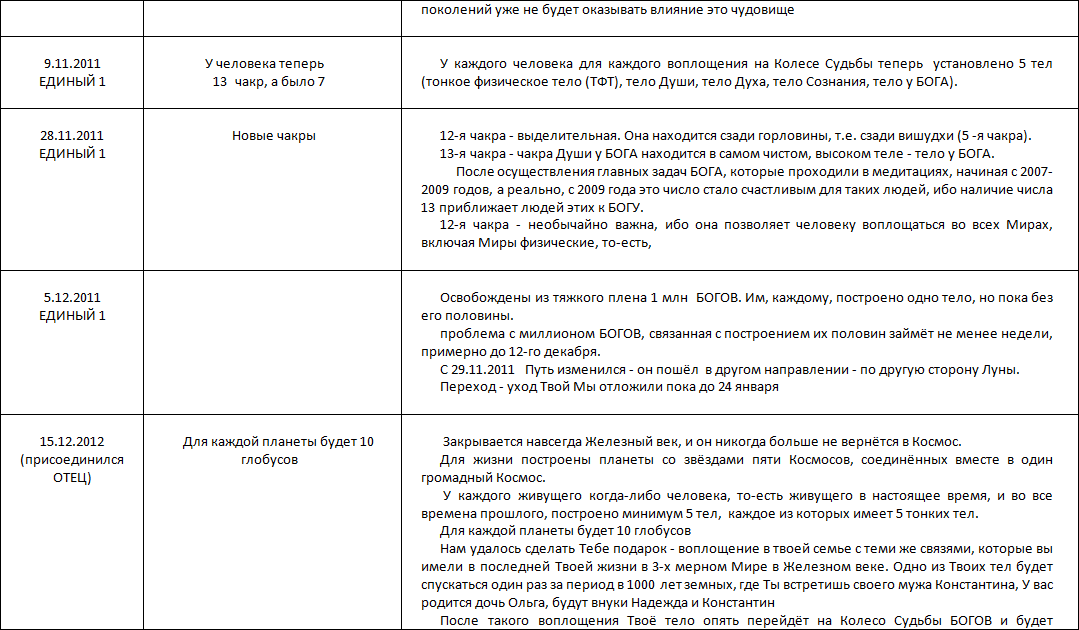 Всё очень даже правильно в КНИГАХ, но в материалах групповых медитаций указано, цель этих медитаций – подготовка человечества в 5-е и 7-е Измерения. Это фактически «иезуитский приём» попытаться на очень высоком духовном уровне ограничить человечество и весь космос в эволюционном развитии вплоть до уничтожения человечества и человека как «биологического вида». Авторы и главные исполнители этой программы – Руководительница ИСХОДА, называвшая себя «Богиней Валентиной – Изидой (воплощённая Валентина Кузнецова)и её главная помощница «Сома). – то, что в «Летописи…» я называю ЧМСД («Чёрные маги – Слуги Дьявола»)